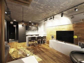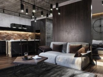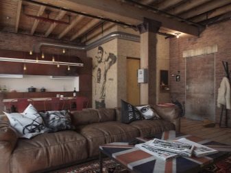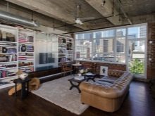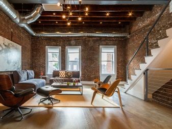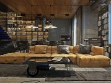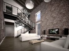 Decorating the interior of the living room in the loft style should convey the effect of a certain negligence coupled with brutal chic. Moreover, for different types of surfaces, it can be different, which is achieved by rational zoning of space. The interior may include columns, wall partitions.