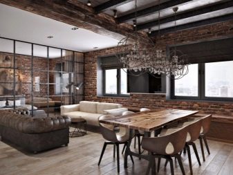 As for the unity of form and color, the loft is not so pretentious. In the design of the living room of this interior design, you can combine the rude wooden furniture of the dining group with bar stools having metal legs of an unusual configuration.