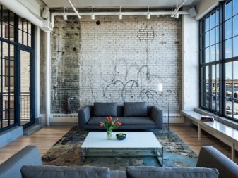 However, the absence of curtains allows you to pay attention to the decor. It uses graffiti, paintings or colorful posters. The arrangement of such a decor is beyond the ordinary. For example, if in a classic interior paintings or panels are hung on the wall, then in the loft they are placed near the wall or placed on high metal stools near the walls in places of desired accents.