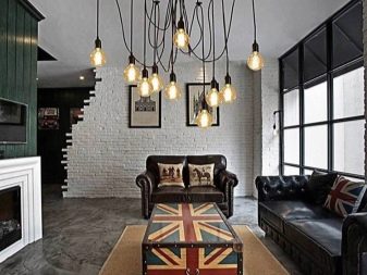 As for lighting, its level in the loft should be equated with that which is usually present in the industrial workshop.In view of this, lighting devices must be appropriate. Their design can be panel, linear, in addition, a creative chandelier (say, the so-called spider model with many light bulbs) can decorate the ceiling space of a loft style living room.