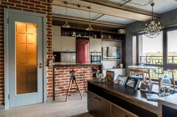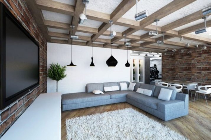 - Adaptation of the loft style by means of brick walls and false beams on the ceiling.
