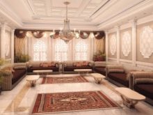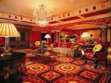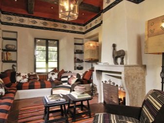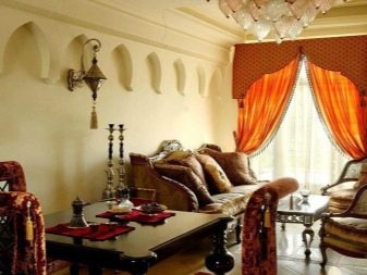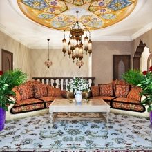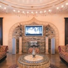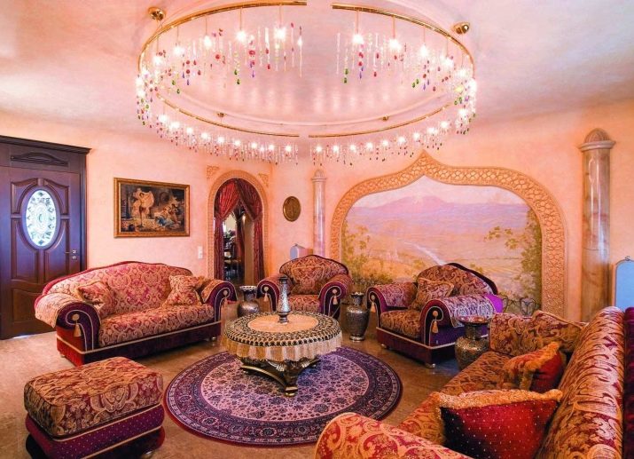 You can describe styles endlessly. But it will be much more correct to look at specific options for their implementation. The photo shows an elegant Arabic-style living room. Multicolor sofas, a table imitating a fountain, a ceiling lamp with pendant decor add splendor. Adaptation to European interiors is expressed in the use of paintings on the wall (painting, as you know, is strictly condemned by Islam).