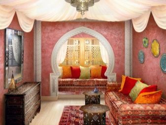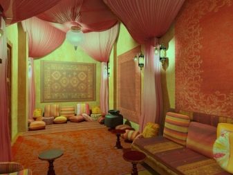In European countries, they rarely use authentic Arabic style. It is more appropriate to talk about the expression of ideas about this design option. Designers try to add motives to the atmosphere that contribute to relaxation and calm. Necessarily use juicy paints. An equally important feature is the use of a large amount of textile, even when decorating the walls.