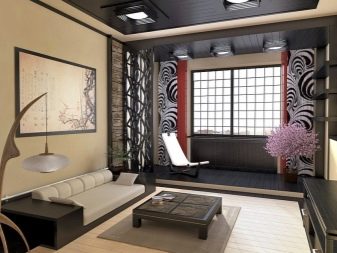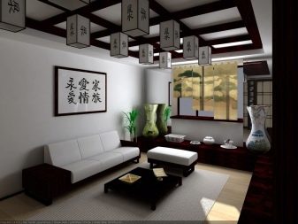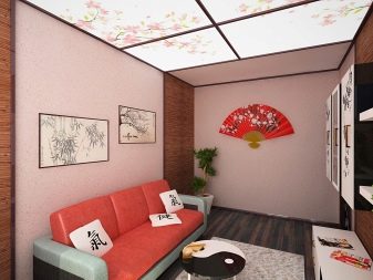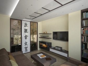And here a completely different - Japanese - approach is embodied. In the design of one of the walls used large hieroglyphs. Low furniture of discreet tones fully fits into the style. Decor is used in relatively small quantities. Mirrored multi-level ceiling only adds charm.
