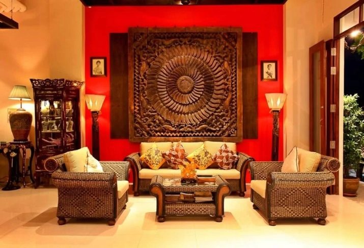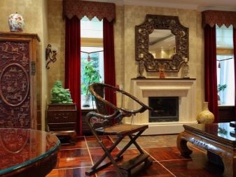 An Indian living room with a red wall just might look like this. Elegant dark wood furniture matches the general orientation of the eastern interiors. Geometric ornaments on one of the chairs add grace. A very light floor compensates for the excess of dark tones in other parts of the room. As in the Chinese style, clear symmetry is maintained.