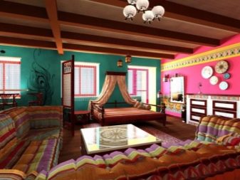 The use of aromatic sticks and dried plant incense helps to further deepen the authenticity of the composition. Coloring varies from soft peach to rich lilac or turquoise. Gold or pearl walls will help to make a room more luxurious. The ceiling is decorated with multilevel structures with the addition of textile paintings.