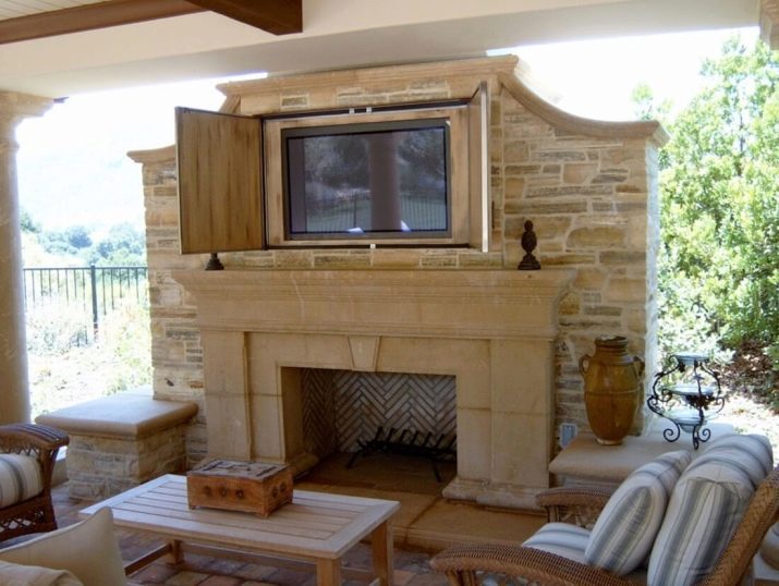 Sometimes you can meet Placing the TV outside the cabinet doors. You can only detect equipment after opening the door. This solution is quite original and suitable for fans of minimalism.