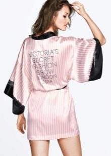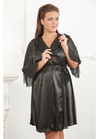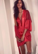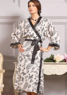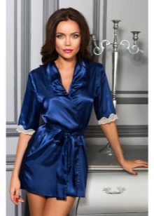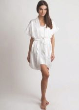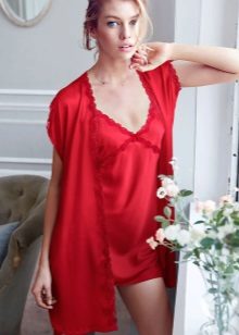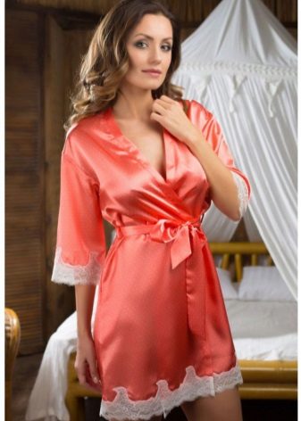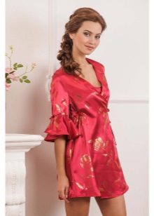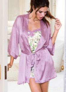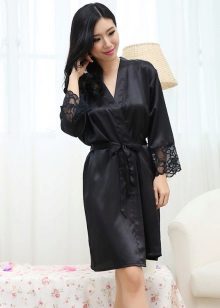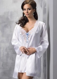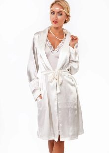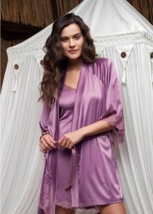 Often, a bathrobe is purchased immediately complete with a nightie, peignoir or pajamas, consisting of a T-shirt and shorts. All of them are made of satin, decorated in the same style, which is reflected both in general at cut and in decor.