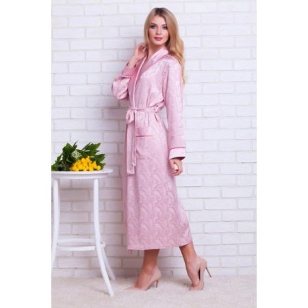 A long satin robe of delicate pink color with a paisley pattern looks like an exit dress. It is ideal for a home meeting with friends, you just need to wear pumps.