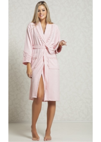 After bathing, bathrobes are put on a wet body, so the most acceptable option here is a kimono-style bathrobe with a deep smell and a belt.