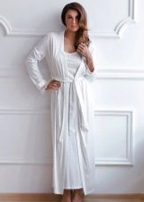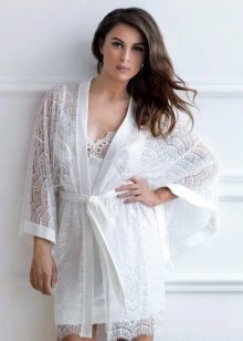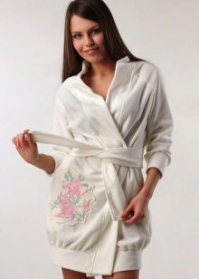- Special attention should be paid to a white mini-length bathrobe. He emphasizes the beauty of the legs and the femininity of the silhouette. Depending on the fabric, a short bathrobe is suitable for both summer and winter. Of course, for the embodiment of a seductive bow, a snow-white short bathrobe is an excellent choice.