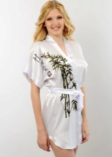 - White bathrobe can be sewn from natural or artificial fabrics. Their choice depends on aesthetic and tactile preferences. Among natural materials, white robes made of silk or cotton are in great demand. Among the variety of synthetic fabrics, you can give preference to a product made of satin, acrylic or viscose.