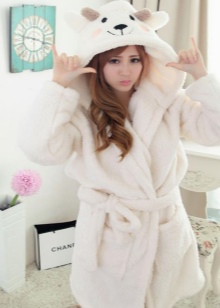 Warm bathrobes with a hood are better to choose for a cold winter. Do not freeze after visiting the bath will allow products with a dense and thick pile. Putting on a soft hood, you will protect your damp head from exposure to drafts and allow your hair to dry faster. These dressing gowns look charming, especially if they are complemented by various decorative elements or stripes.