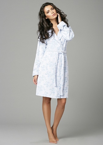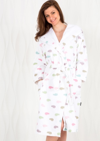 Many manufacturers adorn the neutral white color with various bright patterns and patterns. Dressing gowns with floral prints, butterflies and animals are in great demand. Terry white bathrobes with personalized stripes of gold or silver thread look expensive and luxurious.