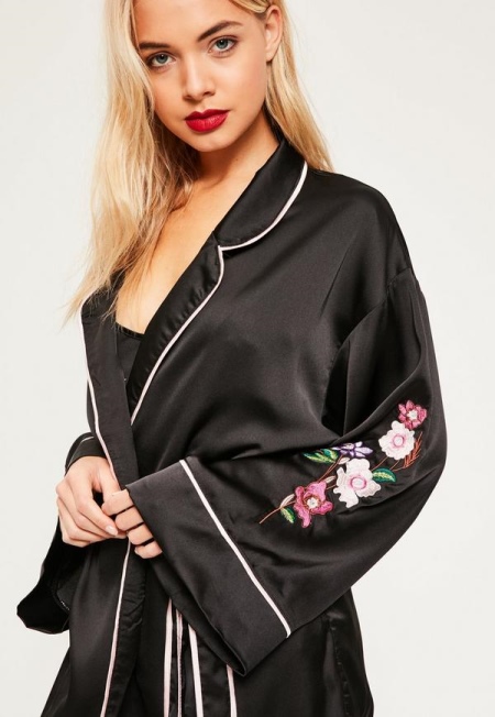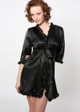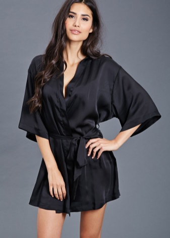 Short black robes made of silk look sexy and intriguing. This model should be chosen by young and slender girls. Often, such models are sewn with lace trim.