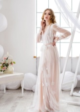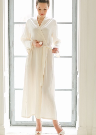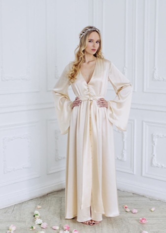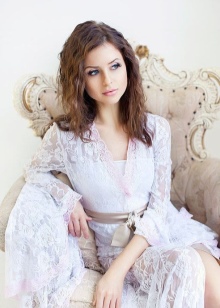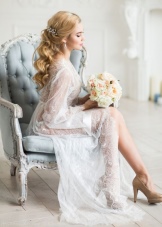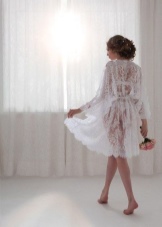 The best material for such a robe is thick, opaque silk. It is good if it will be decorated with lace and matched to match the dress. You should not choose short and candid styles for photographing - the bride in the photo should look elegant and feminine.