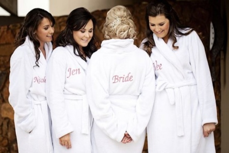 Before the wedding, every bride brings herself to a proper look and attends a beauty salon or spa. In the salon you can also spend part of the bachelorette party. To visit the kingdom of beauty, non-long waffle bathrobes of neutral tones are harmoniously suitable - they are comfortable, perfectly cleaned from stains and go to everyone without exception.