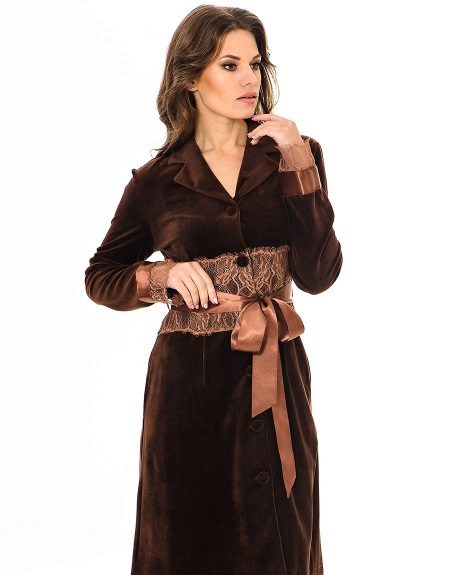 - Strict chocolate - the tongue doesn’t dare to name a cozy medium-sized velor robe with an English collar, incredibly beautiful lace trim on the waist and sleeves, and a satin ribbon belt.