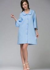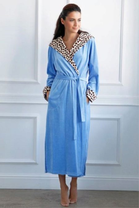 A robe made of blue flannel looks beautiful and attractive, because this shade is now in trend. A long model with the smell of a straight cut looks great in combination with a collar and pockets decorated with a leopard print.