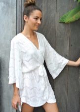 The first image is notable for the fact that this dressing gown has an average length and a light calm color. It is made in the style of a Japanese kimono, repeating its cut: a wraparound robe that rests on the figure thanks to a belt, a V-neck, slightly flared sleeves ¾. This model is suitable for a relaxing evening vacation with your family, but it will not even categorically seem like home clothes in the event of a sudden appearance of guests.