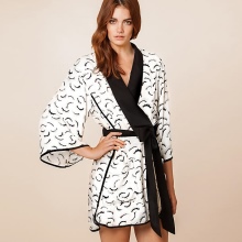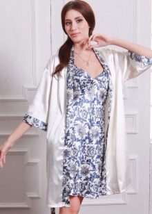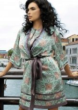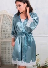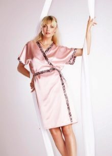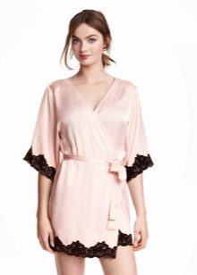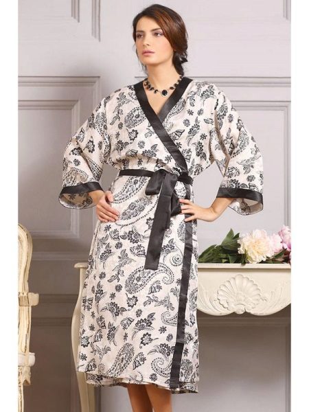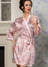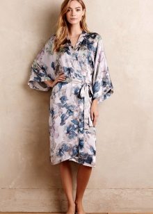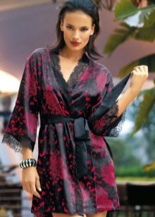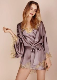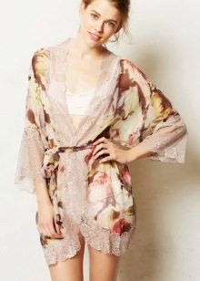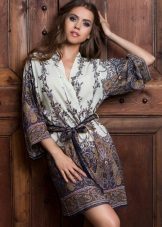 Another medium-sized kimono dressing gown with a calm “home” print, lace lace inserts on the sleeves, giving the overall image of romance and sophistication.