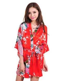 A "hot" scarlet robe repeating Japanese style. It has an erotic length of ultramini and a large floral print. Combined with a classic, but slightly deeper, V-neck, it looks sophisticated and playful. Very suitable for intimate evenings, but not for meeting guests or household chores.