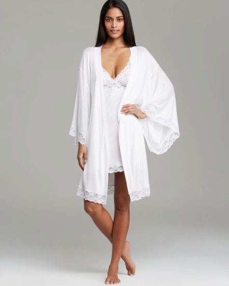 Modern designers enthusiastically attach laces and other textile decorations (satin ribbons, embroidery) to various models. It should be remembered that this type of dressing gown does not accept any fasteners such as buttons, hooks or buttons.