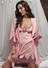 Delicate and at the same time, a charming set of aged pink from a shirt and dressing gown is decorated with a monochrome pattern, leaving a feeling of spontaneity and expression. A playful miniature bow draws attention to the décolleté zone, and graceful lace on the scent and sleeves of the dressing gown add an airy look.