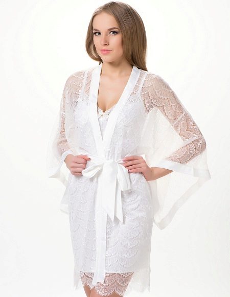 The robe, tailored in the style of a kimono, goes well with an openwork insert that emphasizes the neckline. The translucent material shows much more than it hides.