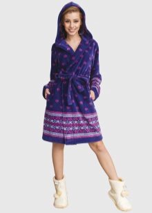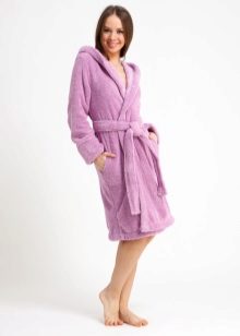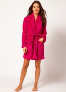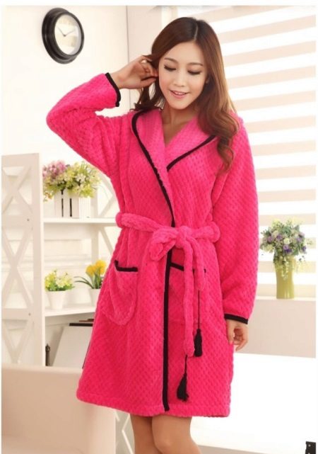- A warm and soft robe to the knee is perfect for young girls. It will be nice to wrap up after taking a fragrant hot bath. Bright raspberry color will cheer you up, and a belt with black tassels will add zest to your home look. After all, a real fashionista in any situation should look perfect.