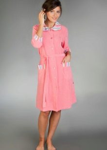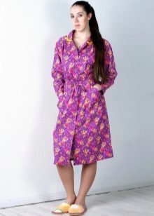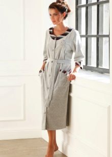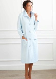 A dressing gown with buttons is very comfortable. The buttons are easy to fasten, they are reliable and do not break. Even if a few buttons come off, you can always replace them with new ones. A button-down robe can be of any length, style or color. Usually these are straight or trapezoidal models that can be supplemented with a belt.