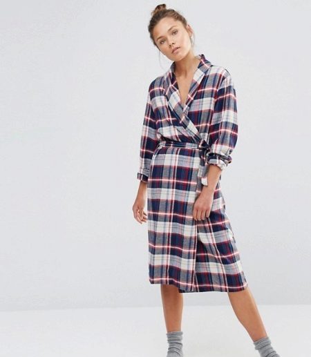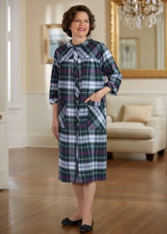 - A checkered flannel robe is perfect for everyday wear. It is not very voluminous, so it does not constrain movements. Thanks to the muted colors, the dressing gown is not very easily soiled, it will not need to be washed often. An elastic waistband will allow you to adjust the size of the dressing gown if you get a little better or lose weight. Very comfortably!