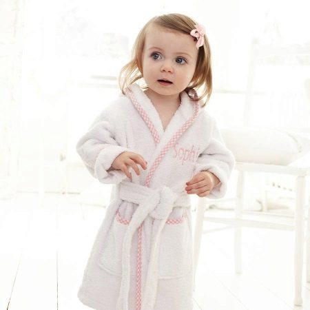 - A fluffy name dressing gown is perfect to wrap your baby in it after bath procedures. In a fluffy terry product, she will be very warm and comfortable. The combination of white with soft pink trim is suitable for a real princess.