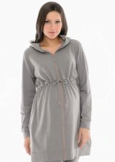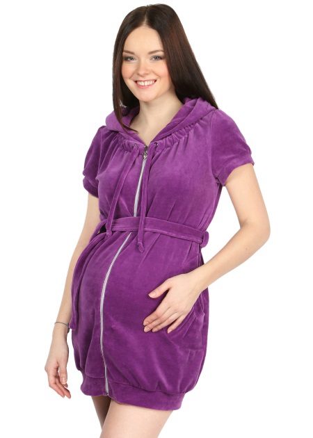 Mini model with a zipper for a young and cheerful expectant mother. The robe of a beautiful bright purple color is made of velor (which is suitable for the cold season), in harmony with the color of the skin and hair of the girl. The item is complemented by a fashionable detail - a hood with a lacing. A thin waist is emphasized by a wide belt, and beautifully draped patch pockets serve as decoration of the product. The model is narrowed below, which emphasizes the slim figure of the girl, despite her pregnancy.