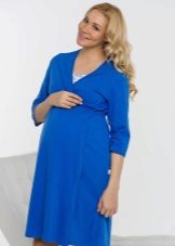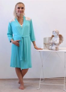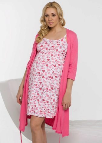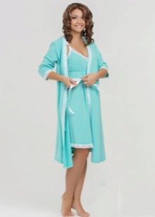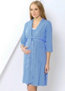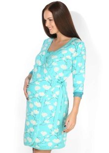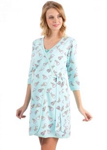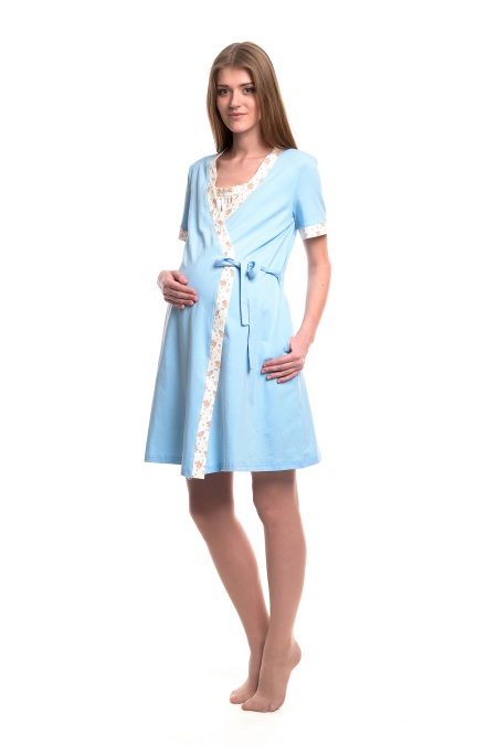 A charming kit for the expectant mother - a bathrobe plus a shirt above the knee. After all, pregnancy is not a reason to hide beautiful legs. The robe with a comfortable short sleeve of delicate blue color has an odor that is fixed by a thin belt. The smell is decorated along the edge with a white stripe with an elegant floral print (the whole shirt was made in such a pattern). Sleeves of clothes are decorated in the same way.