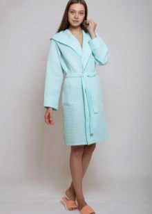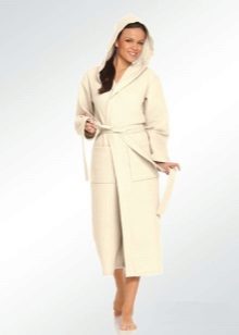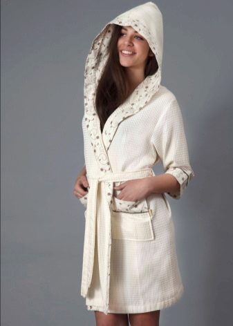 Waffle dressing gowns do not have any canonical style: now both long and shortened models, both with full sleeves and in 3/4 variation, are on the market. Also, the choice of the future owner is left to decide whether the bathrobe should be equipped with a hood or a comfortable collar will be enough. If the thing is selected to be worn after a bath, sauna, shower or bath, it would be logical to look at yourself a robe with a hood so that the wet hair is also warm, like the whole body. In addition, once wrapped in a hood made of waffle fabric, the hair will dry much faster.