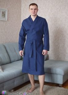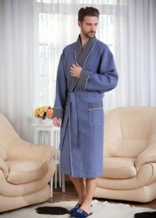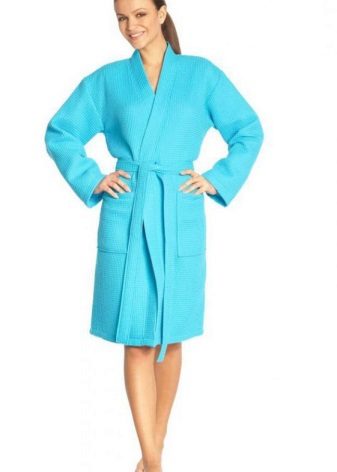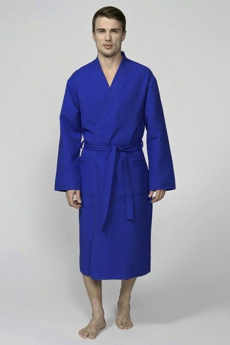 Laconic robe in a large waffle cage, tailored in the style of a traditional Japanese kimono, significantly benefits from the chosen color scheme. Saturated blue gamut contrasts effectively with the skin, and convenient “ears” for threading the belt in them relieve the wearer of such a kimono dressing gown from the need to look for this girdle left somewhere when undressing.