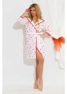 A shortened seductive model made of white waffle fabric emphasizes the tan, and a hood worn on the head makes an elegant emphasis on gorgeous dark hair. Lace trim adds a dressing gown of pastorality, once again focusing on the charge of natural sexuality.