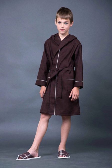 The bath waffle dressing gown for a teenage boy is characterized by narrow horizontal and vertical inserts made of white material, visually emphasizing the child's excellent posture. The rich dark brown color will appeal to the wearer of the dressing gown, and to his mother, the practical and non-marking model will last until his son grows out of it.