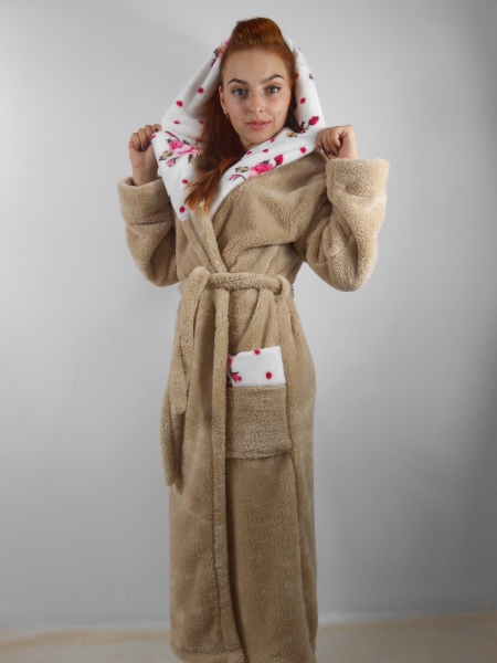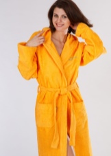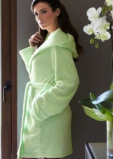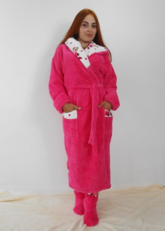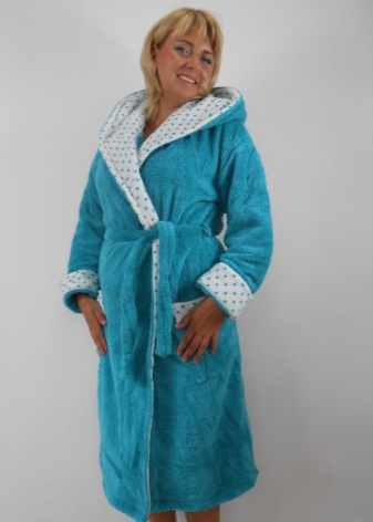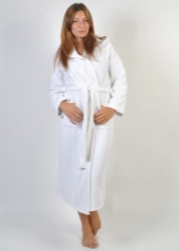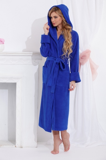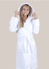 A bathrobe with a hood is usually long. It is put on immediately after taking a bath or shower, allowing the body to gradually cool down and not feel a sharp temperature drop. A bathrobe is also used in the pool. Due to its properties, it absorbs the remaining moisture well, while maintaining maximum comfort after water procedures. Typically, such a dressing gown has a cut with a smell and is tied at the waist with a belt.
