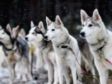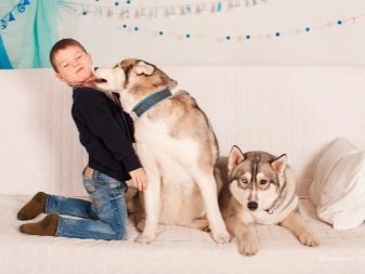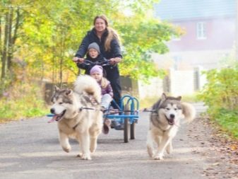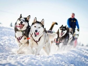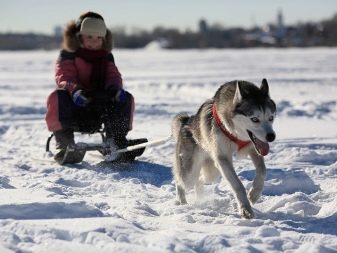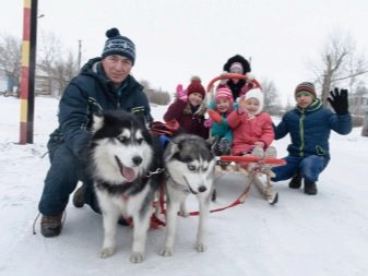 Husky dogs love to ride children and adults on a sleigh, which can be used in the process of upbringing or as an active pastime.