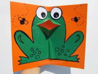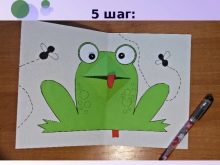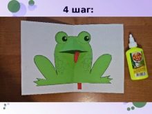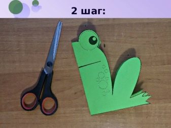 Eyes are either drawn or glued separately. The tongue is cut from another sheet of paper, most often the color is preferable red or pink. One end must be rounded, this can be done with glue. The width is selected so that it matches the proportion of the figure. The tongue adheres to the internal oral cavity separately. If a water lily or background is planned for a frog, then the basis can be prepared by bending the paper in the right direction. It can be blue or green-blue.