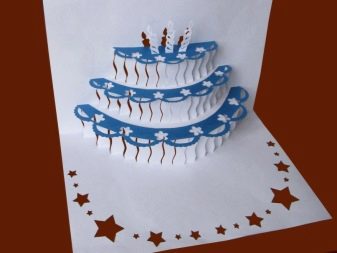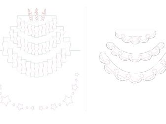 For instance, winter birthday cake, can be made of paper in the form of a card. One of the main steps is to outline clear contours for reproducing the workpiece. Three-dimensional design - properly folded paper. Bends can be marked not only with a dotted line, but also with color, starting from the middle. For example, the blue will be the folds inwards, and the red ones outwards. Empty fields and background around remain for wishes to the recipient of the postcard. If the cake is winter, then a deer can be shown there. Santa's deer and sleigh, for the winter theme, can be cut separately.