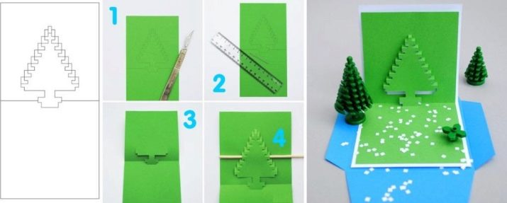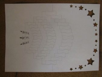 The inner figure of the Christmas tree is cut with a knife strictly along the lines. Then comes the turn of the contour itself along the edges. Bends are best indicated by a dotted line. The outer fold serves as the basis for spruce, while the inner one reproduces it itself. The whole essence of the design is a neat fold and carefully drawn and cut details.