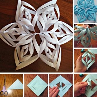 To make a snowflake, you need to fold a square out of paper, sharp corners must be combined with each other.The result should be a small triangle or rectangle, which must be carefully cut without breaking the shape. Next, the figure is folded again, all sharp corners should clearly coincide with each other.