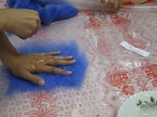 - After the initial rolling, felting begins with your hands, a rolling pin or using a bamboo mat. You can roll and throw the product, like dough. From this, the shrinkage process will occur faster. At the end of felting, the product’s canvas is rinsed from a soap solution and dried naturally.