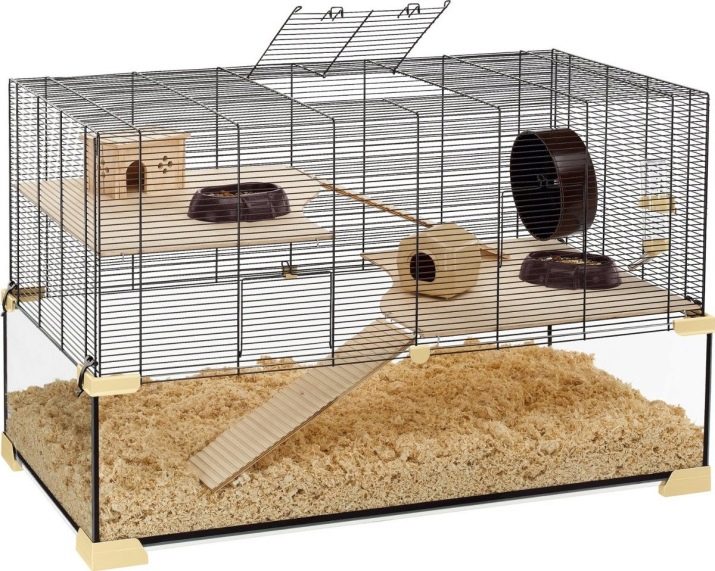 - Three-story and two-story cage. Such dwellings are large. The height between the levels in them should not be too high. On the upper floors, the animal is resting, and the lower ones are used for activities and games. Multi-storey cells can have continuous platforms for their entire length or to the middle. In horizontal continuous areas, there is always a hole for descending the ladder. Often such cells are equipped with pipe tunnels and labyrinths.
