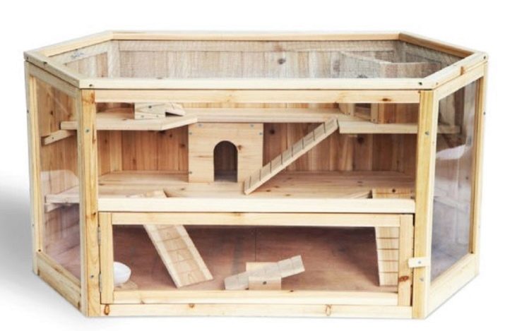 Wooden. The tree is an environmentally friendly raw material and safe for hamsters if hardwood is used. The negative aspects include the high ability of the tree to absorb odors, and it is poorly cleaned. In addition, the price of such cells is very high. Typically, wood is used to make a combined cage in which the frame or floor is wooden and the walls are metal gratings.