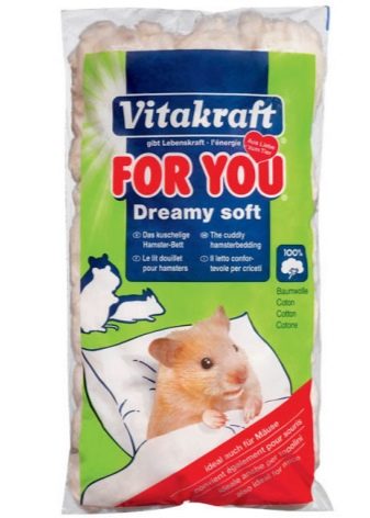 Vata is definitely a controversial option, so it is chosen at your own peril and risk. If you look from the point of view of absorbed moisture, then cotton wool, no doubt, absorbs moisture faster than others, but the smell does not hold at all. Another minus is that cotton wool is made of fibers, because of which the rodent can become tangled and damage the legs.