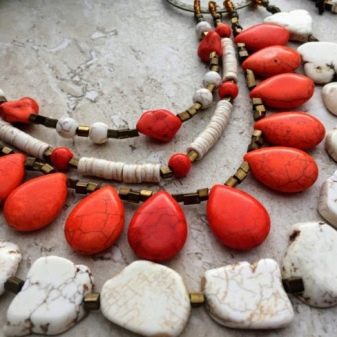 The mineral is often painted in red shades, while it is very similar to coral. He copes with the imitation of various pebbles. Even the unpainted version is often given out for white turquoise, which also costs a lot. Each option looks rich and elegant, so it can be quite difficult to draw a clear line between howlite and turquoise or coral.